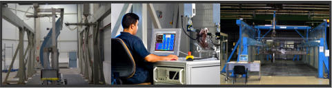Squirter based Inspection systems The extensive use of composite materials in manufacturing of aerospace and naval parts and structures is dictating an increasing need for adequate, reliable, high throughput inspection systems. Structural parts can be scanned using various configurations of squirter systems, in both pulse-echo and thru-transmission modes. ScanMaster offers all possible scanning configurations, including overhead gantry with travelling bridges, dual scanning towers, flatbed scanners, and systems based on industrial robots. ScanMaster squirter systems are designed to inspect a wide range of aerospace structures, from flat panels to complex curvature parts. Both conventional, high penetration UT and phased array technologies are available.