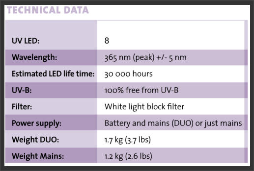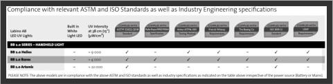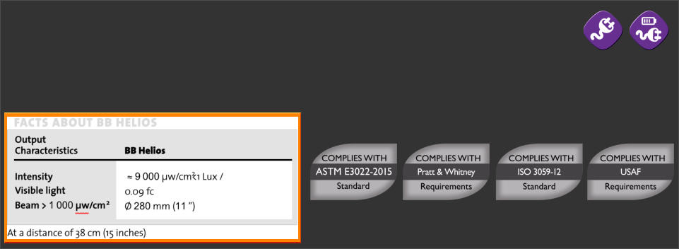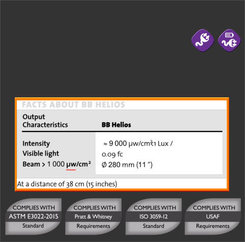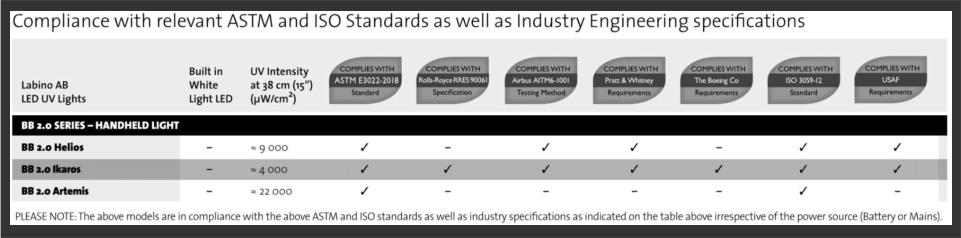 BB 2.0 Ikaros has been tested to comply with both ASTM E3022-18 and ISO 3059-12 standards as well as with the internal requirements of all PRIMES seen in the table below, including Rolls-Royce RRES 90061 and Airbus AITM6-1001. It generates an intensity of approximately 4,000 µw/cm² (40W/m2) at 38cm (15 inches) and it does not have a white light LED. The running time of the battery version is 7 hours (constant use)