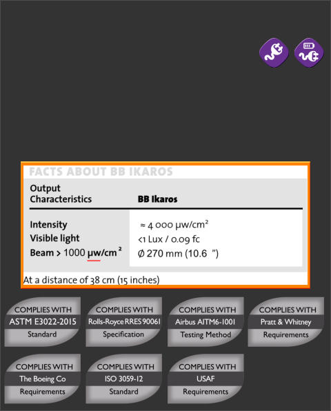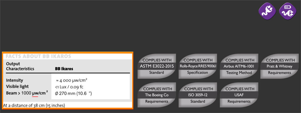 BB 2.0 Ikaros has been tested to comply with both ASTM E3022-18 and ISO 3059-12 standards as well as with the internal requirements of all PRIMES seen in the table below, including Rolls-Royce RRES 90061 and Airbus AITM6-1001. It generates an intensity of approximately 4,000 µw/cm² (40W/m2) at 38cm (15 inches) The running time of the battery version is 7 hours (constant use)