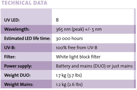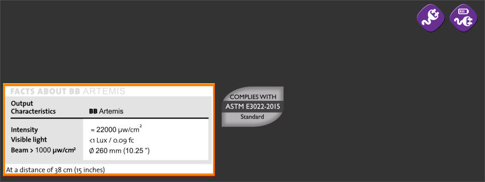 BB Artemis has been tested to comply with both ASTM E3022-18 and ISO 3059-12 standards. It generates an intensity of approximately 22,000 µw/cm² (220W/m2) at 38cm (15 inches). The running time of the battery is 5 hours (constant use).