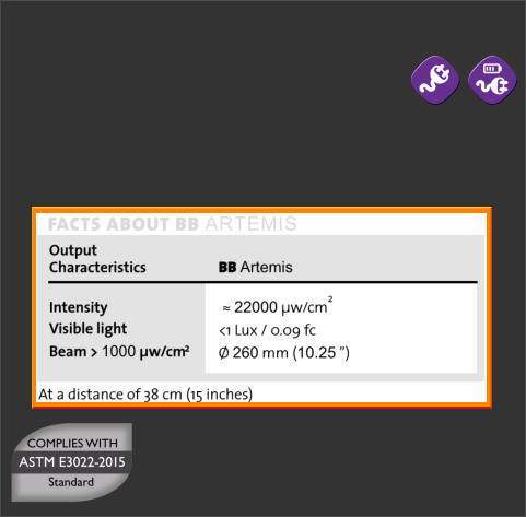 BB 2.0 Artemis has been tested to comply with both ASTM E3022-18 and ISO 3059-12 standards. It generates an intensity of approximately 22,000 µw/cm² (220W/m2) at 38cm (15 inches). The running time of the battery is 5 hours (constant use).