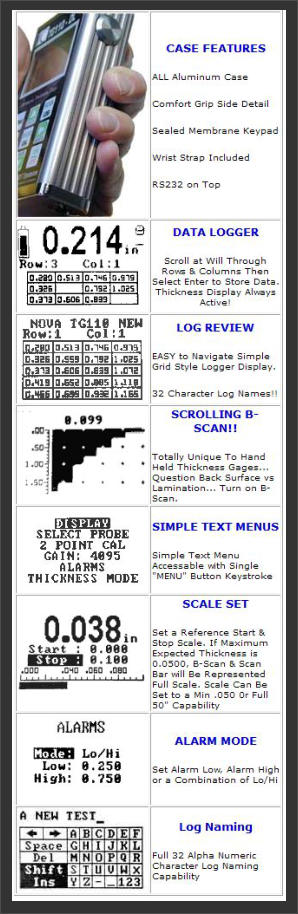 CB110 Sidewinder - Sonic Thickness Gauge • Cylinder bore wall thickness • Data logging, results mapping • Scrolling scan view • Special probes and fixtures • USB, data logging, alarm modes Introducing.... The Nova CB110 Sidewinder Sonic Tester, Designed Specifically AUTOMOTIVE Inspection requirements. Applications include Cylinder Bore Inspection, Head Porting, Chassis & Body Members, Roll Cage Thickness Inspection and More... Measuring the wall thickness of automotive cylinder bores, head ports and other components can be important for quality control in manufacturing or in a boring process where a minimum thickness must be maintained. Cast aluminium or steel engine blocks can be difficult to inspect with complex geometry and limited access. Ultrasonic thickness gauging allows for these measurements to be made. With dedicated probes that are contoured to the shape of the cylinder or pencil probes to access tight spaces, thickness measurements can be made with confidence. Whether you are building a Hard Core Racing Machine or restoring a Timeless Classic, the Nova CB110 Sonic Checker will meet virtually all of your automotive inspection requirements. No other hand held instrument with this ease of operation can offer the kind of information available from the CB110 Sonic Tester. By pressing one single key you are presented with the unique ability to display a LIVE, Scrolling Cross Section View or plot of the inspection zone, trouble areas will simply jump out. Just slide the sensor up or down an area of interest, such as a cylinder bore and you will be presented with a Cross Section View of that scan line. The results are very revealing! Along with the Scrolling Cross Section View, the CB110 Sonic Tester can store individual thickness readings in a ready made log file for each cylinder for download or report printing at a later time. Log files are stored using up to 32 characters therefore allowing the identification of the block or customer as an example... No other gauge offers this professional approach to engine inspection and reporting. These reports can be printed directly from the CB110 Sonic Checker itself to an available portable printer or saved to a PC via the Data Transfer Kit. The CB110 Sonic Tester is available with a broad array of sensors for those complex inspection requirements such as seen when inspecting various ports of a Cylinder Head. Additionally, we can design a sensor for virtually any geometry as required. Although the CB110 Sonic Tester offers the most extensive set of features available in a hand held thickness gauge, we recognize you may just want to simply measure thickness. Nothing could be easier. Simply "zero" the sensor and calibrate the unit by pressing the thickness up or down arrows... NO MENUS involved!! This is an instrument you can truly grow with as needed. Applications Include • Cylinder Bore Cross Section • Cylinder Bore wall thickness • Port wall thickness Features • Dual Element: Can only use double element probes • Alarm Mode: Alarm mode on limits • Auto Zero: Can automatically zero thickness • Adjustable Gain: Gain can be adjusted • Data Logging: Data logging in gauge • Scrolling B-Scan: Displays Time based B-scan • Variable Units: Change between mm/ inch • Multi-Probe: Can use multiple probe types • Hand-held: Designed for hand-held use • Data Transfer: Can be connected to PC • USB Connectivity: USB port • Auto Probe Recognition: Automatically recognizes probe type • Adjustable Velocity: Velocity can be adjusted • Point Calibration: Single & Two point calibration • Min/ Max Mode: Measures maximum and minimum thickness • Cylinder Bore: Automotive cylinder bore inspection mode • Standard package includes: -  cable, transducer and Pelican style shipping/ storage Hard Carry Case • Engine data log mode • Back light - on/off/auto • Coupling Indicator Differential mode. Deviation from defined thickness. • Time encoded B-scan (cross-sectional scan view) • Direct Velocity measurement (option) • Miniature sonic checker
