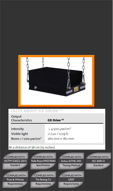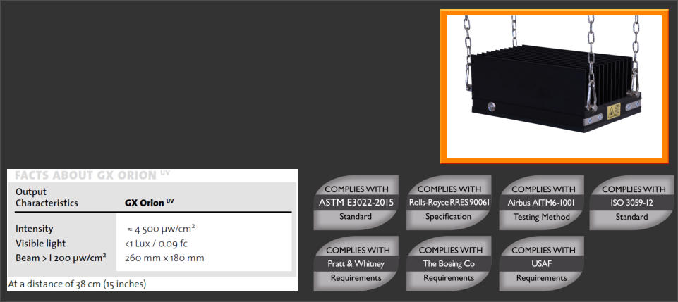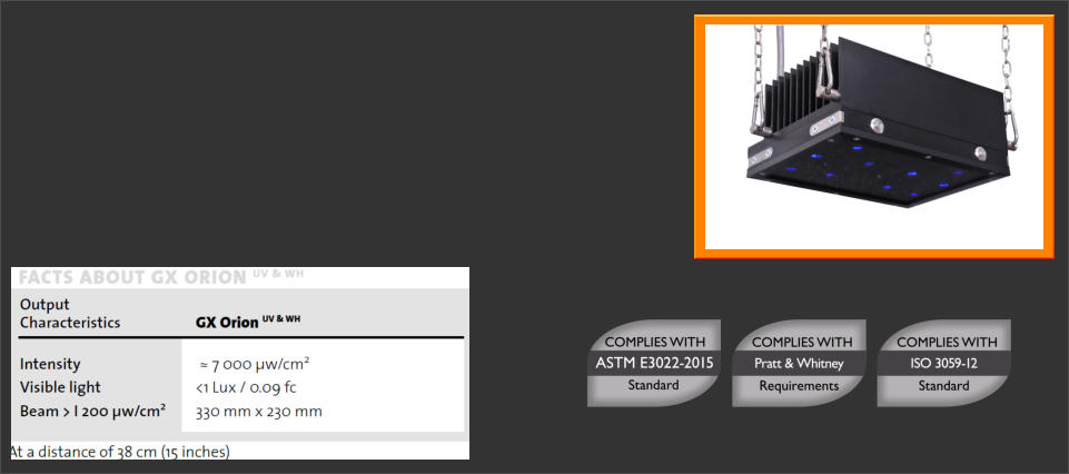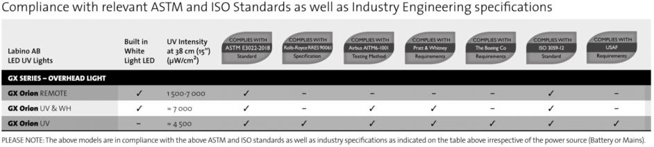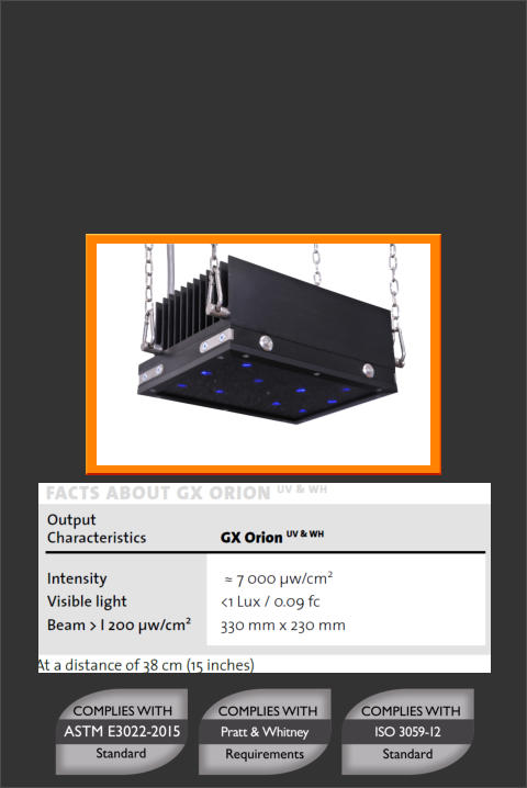 Labino GX Orion UV has been tested to comply with both ASTM E3022-18 and ISO 3059- 12 standards as well as with the internal requirements of all PRIMES seen in the table below, including Rolls-Royce RRES 90061 and Airbus AITM6-1001. It generates an intensity of approximately 4,500 µw/cm² at 38cm (15 inches). This model does not have a white light or remote, it comes with one UV ON/OFF Button.