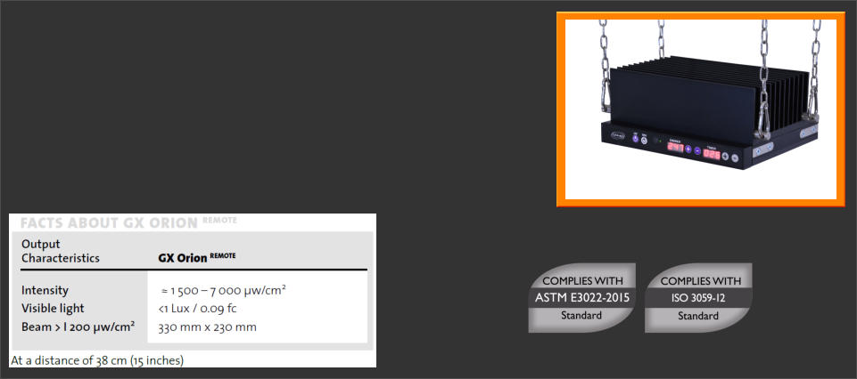 Labino GX Orion UV & WH has been tested to comply with both ASTM E3022-18 and ISO 3059-12 standards. It generates an intensity of approximately 7,000 µw/cm² at 38cm (15 inches). It has a powerful white light that can generate 1,000 lux (93fc). This model does not have a remote, it comes with one UV and one White light ON/OFF button.