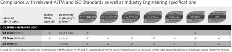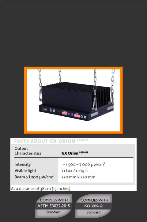 Labino GX Orion REMOTE has been tested to comply with both ASTM E3022- 18 and ISO 3059-12 standards. It generates an intensity that can adjusted to vary from approximately 1,500 to 7,000 µw/cm² at 38cm (15 inches). It has a powerful white light that can generate 1,000 lux (93fc) at 30 cm (12 inches). A remote control allows you to switch on/off the UV and White light, change the intensity and set up the timer from up to 5 meters (16 feet) away.