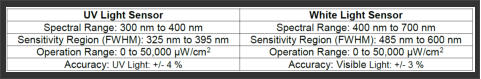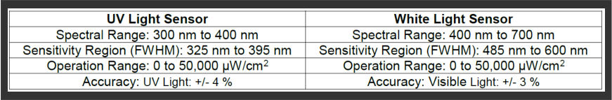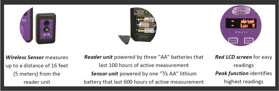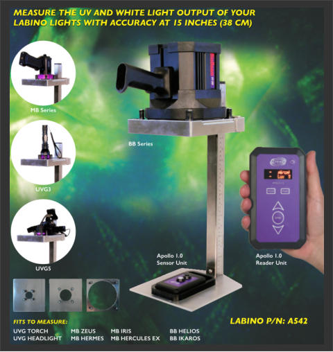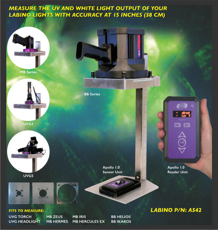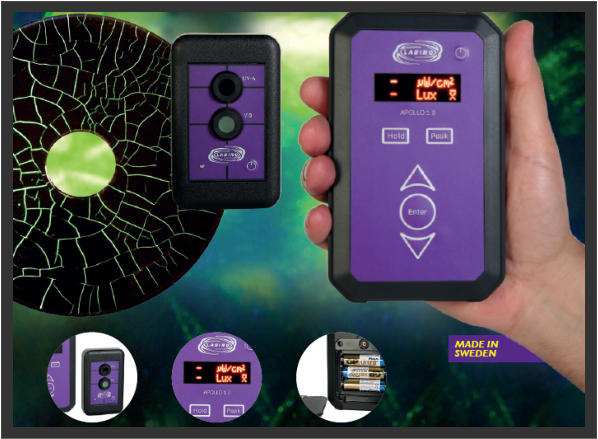 Labino Apollo 2.0 Meter - M505 Measures UV and Visible light via a wireless sensor Radiometer and Photometer in one instrument - small enough to fit in a pocket. Labino Apollo 2.0 Radiometer/Photometer is an instrument for accurate measurement of UV-A irradiation and visible illumination. Extra engineering effort is taken to make an accurate measurement of visible light emission from a UV-A lamp by incorporating a superior band pass filter stack containing only non-fluorescent filters. The instrument provides fast measurement as it offers auto ranging and concurrent measuring of visible light and UV-A irradiation. Apollo 2.0 is traceable to NIST, SP & ISO 3059. Wireless Sensor via Blue-tooth Sensor measurements and transmission of data is done via Blue-tooth. This enables the user to measure from a distance of up to five meters. This feature ensures that the sensor unit is stable and no movement occurs from connecting cables during measurement. Light and Compact The Apollo 2.0 Meter is ergonomic and easy to use due to its light weight chassis, wireless sensor unit and compact size. The reader unit weighs 194 grams (6.84 oz) and the sensor unit 100 grams (3.53 oz). The dimensions of the reader unit and the sensor unit are 145 x 89 x 25 mm and 108 x 68 x 23 mm respectively. Advantages Over Traditional Meters A. WIRELESS: Sensor measurements and transmission of data is done via blue-tooth. The wireless sensor enables the user to measure from a distance of up to five meters. This feature ensures that the sensor unit is stable and no movement occurs from connecting cables during measurement. B. CALIBRATIONS NEED NOT DISRUPT YOUR OPERATIONS: A user can buy a double kit (1 reader, 2 sensor units) and only send one sensor for calibration, while making use of the other, so that operations are never disrupted. Each sensor unit has both a UV and White light sensors incorporated within it. C. EASE OF USE:  The Labino Apollo 2.0 Meter is ergonomic and easy to use due to its light weight chassis, wireless sensor unit and compact size. The back light in the display comes on automatically when measuring in a dark area and it provides an auto ranging for visible light and UV light simultaneously. The meter features both hold and peak functions. • Hold function: By pressing the Hold button the present value is stored. • Peak function: By pressing the Peak button the sensor automatically stores the highest value measured.