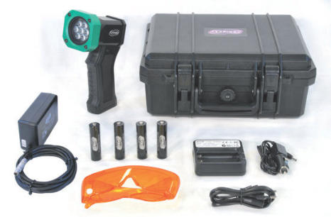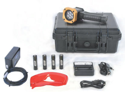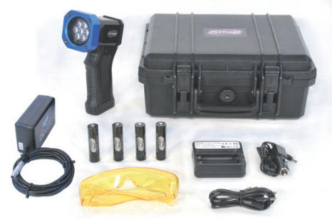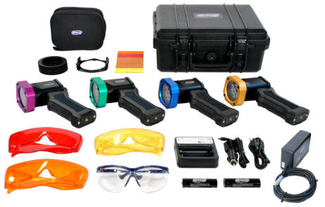 The Labino MB Aris LED Light Crime Kit - Alternative Light Sources (ALS) are invaluable for detecting substances (forensic trace) at a crime scene such as: body fluids (semen, urine, saliva, vaginal fluids, blood, sweat etc.), bruising, hair, fibres, foot prints, fingerprints, Ninhydrine (treated fingerprints), Super glue (treated fingerprints), Lumicyano Treated Fingerprints, Fluorescent dyes, powders, stamps, markers, basic yellow 40, Cyanoacrylate, (SmartWater TM) and general searching.