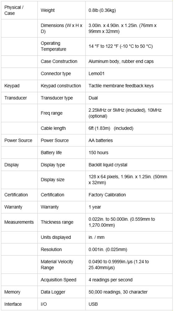 Nova TG110-DL Digital General Purpose Ultrasonic Thickness Gauge Technical Specification Table Nova TG110-DL Ultrasonic Thickness Gauge Standard Kit Contents