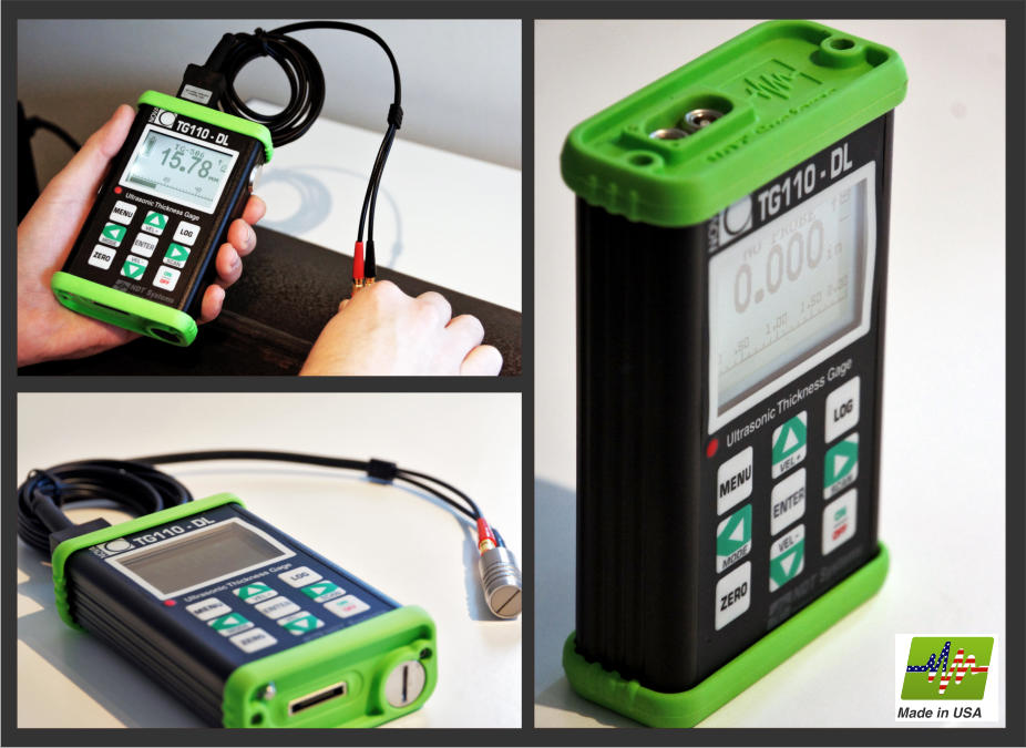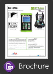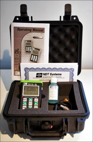 With all the Ultrasonic Thickness Gauges available today, how do you decide which one offers the best performance, features and value... Look no further. The ALL NEW Nova TG110-DL offers all of this from a Pioneer in Digital Ultrasonic Thickness Testers. NDT Systems has been bringing leading edge, high technology ultrasonic products to the market for 30 years. Very few companies can make this statement today. The Nova TG110-DL defines the standard for performance and value in Ultrasonic Thickness Gauges. It would be difficult, if not impossible to find a gauge offering the long list of STANDARD features the TG110-DL does. For about the price of the competition's current fixed velocity, entry level Gauge, NDT Systems is offering a fully loaded thickness gauge. Compare the STANDARD List of Features with Other Available Ultrasonic Thickness Gauges... • Exclusive Analogue Style Scan Bar - STANDARD • 128x64 Graphic Display - STANDARD • 50,000 Point Data Logger - STANDARD • Patented Probe Recognition - STANDARD • Linear or Grid Logging - STANDARD • Legacy Probe Library - STANDARD • EXCLUSIVE Scrolling B-Scan - STANDARD • FULL Velocity Adjustment - STANDARD • Hi/Lo Alarms - STANDARD • Differential Thickness Mode - STANDARD • High Speed Scan Mode - STANDARD • Minimum Thickness Capture Mode - STANDARD • Single & 2 Point Calibration - STANDARD • Patented Keyboard Lock Feature - STANDARD • Pelican Style Hard Carrying Case - INCLUDED • Alkaline AA Cells - INCLUDED • TG506 Transducer - INCLUDED • LMD1 Cable - INCLUDED The Standard Nova TG110-DL Kit contains: 1 x Nova TG110-DL Ultrasonic Thickness Gauge 1 x TG506 Ultrasonic Transducer 1 x LMD-1 Probe Cable 1 x Data Transfer Kit c/w Software & USB Cable 1 x UltraGel II Ultrasonic Couplant 1 x Wrist Strap 1 x Operating Manual 1 x Certificate of Conformity 1 x Hard Carry Case The Through Paint Nova TG110-DL-TP Kit contains all of the above plus: 1 x TG560P Ultrasonic Through Paint Transducer 1 x Through Paint Software (Pre installed in the Supplied Gauge) (The Through Paint model eliminates the paint/coating thickness from the overall total thickness so only the material under test is measured.)