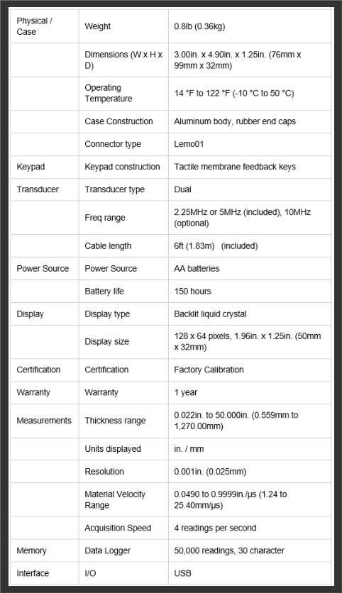 Nova TG110-DL General Purpose Ultrasonic Thickness Gauge  • Class leading performance for the price • Auto Probe Recognition • Time encoded B-scan • Multi-probe capability (Compatible with 10 probe types) • USB, data logging, alarm modes Nova TG110-DL Ultrasonic Thickness Gauge INCLUDING Transducer, Cable, Case, 50,000 Point Data Logger, Scrolling B-Scan, Spreadsheet View (GridView), Analogue Style Scan Bar, High/Low Alarm, Single & Dual Point Calibration and much more as standard. The Nova TG110-DL Thickness Meter defines the standard for performance and value in Digital Ultrasonic Thickness Gauges. It would be difficult, if not impossible to find an Ultrasonic Thickness Gauge  offering the long list of STANDARD features the TG110-DL does. For about the price of the competition's current fixed velocity, entry level gauge, Advanced NDT Limited is offering a fully loaded data logging ultrasonic testing thickness gauge. The TG110DL offers fully adjustable velocity for perfect calibration. Most instruments in this price range offer you only a single velocity setting. This is where most others stop & the TG110 DL keeps going. Other features include data logging, single and dual point calibration capability, High & Low Alarms, High Speed Scan mode and an included time encoded 'B' Scan. The TG110-DL is housed in a custom, all aluminium enclosure with gasketed ends. The case is designed for maximum comfort whilst offering the user maximum grip along the sides and back surfaces. Most other gauges have smooth surfaces that once wet with couplant are difficult to hold. The display is a full 128 x 64 pixels (1.96" x 1.25") and incorporates simple language text for all menus. This is an industry first at this price point. Try that on the usual 7 segment display unit. Along with the 1/2" high primary numeric readout area an analogue style "Scan" bar is located at the bottom of the screen and represents a visual indication of the current material wall thickness. This is particularly useful while in the high speed scan mode. The eye can perceive these linear movements much easier than rolling digits making general thickness trend information easier to interpret. Additionally, a graphic display permits logged data to be displayed in a grid fashion, much like a spreadsheet. The user can review the log by scrolling through the rows and columns much like a spreadsheet. Any value above or below a pre-set value will cause that cell to flash in the spread sheet view. Metals, plastics, ceramics, glass or virtually any other material which conducts ultrasound can be accurately gauged over a wide range of thickness'. An optimized combination of high penetrating power and resolution make the miniature Nova TG110DL the choice for a countless variety of thickness measurement jobs, whether in the plant, field or the lab. One of the most outstanding uses for the TG110DL is to assess material thinning due to corrosion or erosion, including many types of pitting action. The Nova TG110DL Thickness Tester has proven ability to handle an exceptional range of adverse gauging conditions such as rough surfaces, contours and high temperatures, even tough to penetrate materials like cast iron. You'll Find the NOVA TG110-DL at home in rugged field sites like refineries, pipelines and construction jobs, as well as shipyards, foundries, power plants, and throughout industries like automotive, mining, rail roads, and primary metals producers, even in food processing, paper production, plastics, ceramics and glass making. Through Paint capability is available as an option. Both the standard version (TG110-DL) and the through paint version (TG110-DL-TP) will measure through paint and coatings etc. however the TG110-DL-TP will eliminate the paint thickness from the total thickness measured (material under test plus paint) giving you the material thickness only (material under test minus the paint). Thickness Gauging Applications include: Corrosion, pitting, tanks, tube, pipe, glass, boilers, heat exchanger tubing, rolls, pressure vessels, machined parts, flanges, bridges, airframes, aircraft windows, glass plate, vessels, plastic shapes and pipe and containers, ship hulls/decking storage tanks, bulkheads boilers, axles, wheels, rails, steam lines, castings, pipes / tubing, plates / slabs / blooms casings, billets / bars, extrusions, forgings beams / struts and many more. Features • Dual Element: Can only use double element probes • Alarm Mode: Alarm mode on limits • Differential Mode: Differential measurement from set value • Auto Zero: Can automatically zero thickness • Adjustable Gain: Gain can be adjusted • Data Logging: Data logging in gauge • Scrolling B-Scan Displays Time encoded B-scan • Variable Units: Change between mm/ inch • Multi-Probe: Can use multiple probe types • Hand-held: Designed for hand-held use • USB Connectivity: USB port (Data Logging Software Included) • Auto Probe Recognition: Automatically recognizes probe type • Adjustable Velocity: Velocity can be adjusted • Point Calibration: Single & Two point calibration • Min/Max Mode: Measures maximum and minimum thickness • Compatible with 10 probe types • Back light- on/off/auto • Echo to echo mode to measure through paint (Optional Extra) • Coupling Indicator • Direct Velocity measurement (option) • Standard package includes cable, transducer, data transfer kit, manual, cert, couplant and Pelican style shipping/ storage hard carry case
