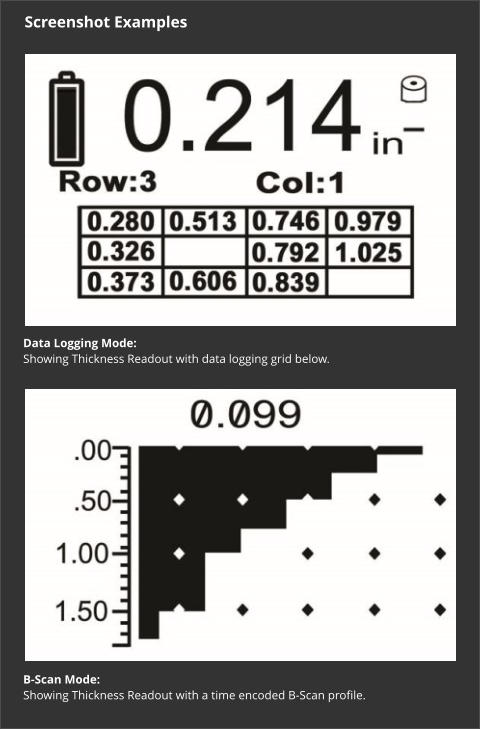 Screenshot Examples Data Logging Mode: Showing Thickness Readout with data logging grid below. B-Scan Mode: Showing Thickness Readout with a time encoded B-Scan profile. Brochure BROCHURES PRODUCTS