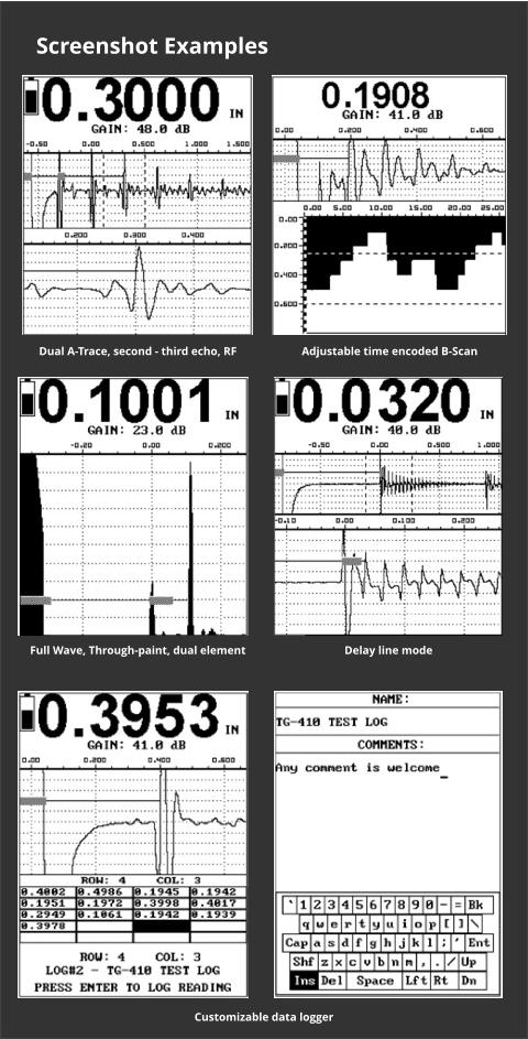 Screenshot Examples Dual A-Trace, second - third echo, RF  Adjustable time encoded B-Scan  Full Wave, Through-paint, dual element Delay line mode Customizable data logger Brochure BROCHURES PRODUCTS