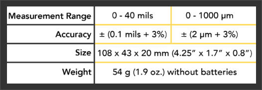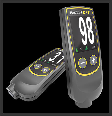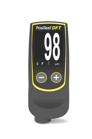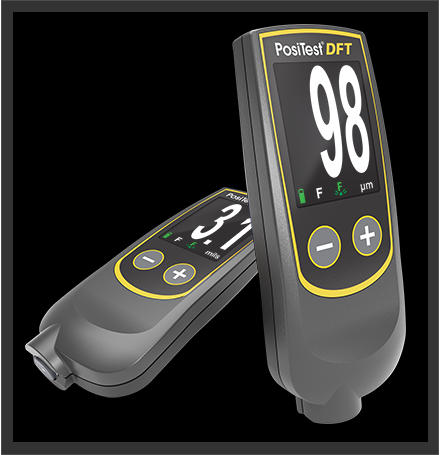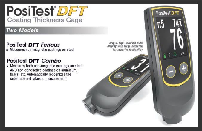 The PosiTest DFT is available in two models. The Ferrous which measures non-magnetic coatings on steel and the Combo that measures both non-magnetic coatings on steel AND non- conductive coatings on aluminium, brass, etc. and automatically recognizes the substrate and takes a measurement. Simple • Fast, repeatable measurements — 60+ readings per minute • Ready to measure - No adjustment required for most applications Versatile • V-groove in probe for positioning on curved parts • High contrast color display • Adjustable display brightness for optimal visibility in all environments • Auto rotating display with rotation lock • Simple icon based menu • Mils/microns switchable • Built-in wrist strap for added convenience and safety • Mils/Microns switchable Durable Strong, wear-resistant, ruby-tipped probe Two year warranty Accurate Zero or 1 Point Calibration Adjustment for complex applications Onscreen averaging for up to 99 readings Ideal For • Powder Coaters • Paint Applicators • Coating Inspectors • Painting Contractors • Automotive Detailers, Refinishers and Inspectors Features • Fast, repeatable measurements • Ready to measure – No adjustment required for most applications • Zero or 1 Point Calibration Adjustment for complex applications • Onscreen averaging for up to 99 readings • Strong, wear-resistant, ruby-tipped probe • V-groove in probe for positioning on cylindrical parts • High contrast colour display • Adjustable display brightness for optimal visibility in all environments • Auto rotating display with rotation lock • Simple icon based menu • Handy RESET feature when no zero reference is available • Mils/microns switchable • Built-in wrist strap for added convenience and safety • 2 year warranty on body AND probe