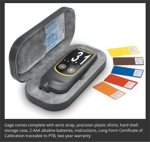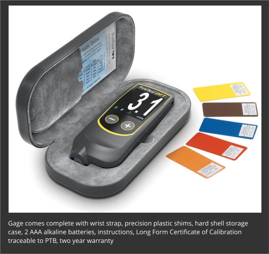 Gage comes complete with wrist strap, precision plastic shims, hard shell storage case, 2 AAA alkaline batteries, instructions, Long Form Certificate of Calibration traceable to PTB, two year warranty Brochure BROCHURES PRODUCTS