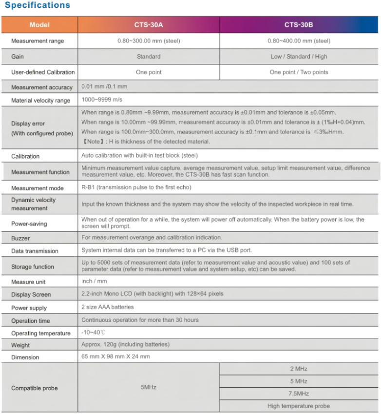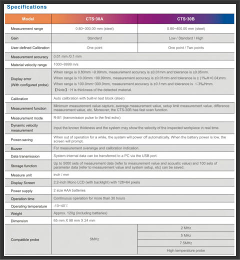 SIUI CTS-30A & CTS-30B - Ultrasonic Thickness Gauges SIUI CTS-30A & CTS-30B Ultrasonic Thickness Gauge Technical Specification Table SIUI CTS-30A & CTS-30B Ultrasonic Thickness Gauge Brochure button REQUEST QUOTE Advanced NDT On-Line Shop Button Request Quote Advanced NDT On-Line Shop Button SHOP
