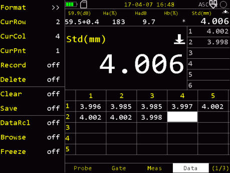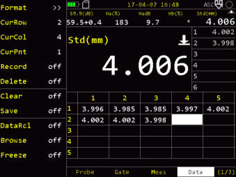 SIUI Smartor Digital Ultrasonic Thickness Gauge Screenshot Showing Data Set Management (Data Logging)