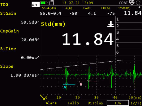 SIUI Smartor Digital Ultrasonic Thickness Gauge Screenshot Showing TDG - Time Distance Gain Curve