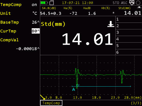 SIUI Smartor Digital Ultrasonic Thickness Gauge Screenshot Showing TempComp Function