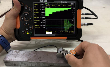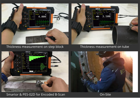 Thickness measurement on step block Thickness measurement on tube On-Site Smartor & PES-02D for Encoded B-Scan ULTRASONIC THICKNESS GAUGES ULTRASONIC FLAWDETECTORS ULTRASONIC THICKNESS GAUGES REQUEST QUOTE BUYON-LINE CONTACT US SHOP