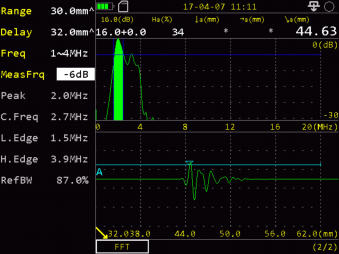 SIUI Smartor Highly Portable Digital Ultrasonic Flaw Detector Screenshot showing the Probe Spectral Analysis