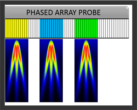 Multibeam acquisiton mode combined with Multi-angle: With Phased Array FAAST, it can perform all angles within one single shot. The advantage of its flexibility is that if tomorrow one customer wants to inspect in more angles, it allows to setup more beams simply by Software settings in order to increase the quality, or to answer to any upcoming new requirements and keeping the same productivity, giving thus a huge saving to any upcoming situation. In comparison with conventional Phased Array, which should require 3 sequential shot, angle 1, angle 2, then angle 3, before shifting of 2 elements for another cycle of 3 shots when using scanning mode, Socomate's technology perform in 1 single shot, all angles in each aperture, and then process of the 2 elements shift.