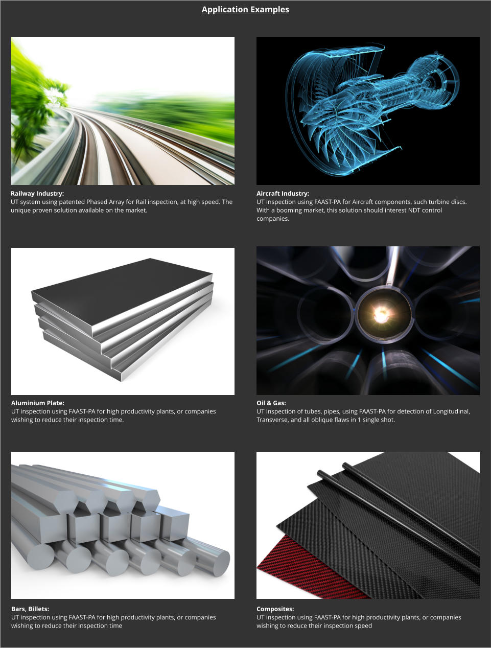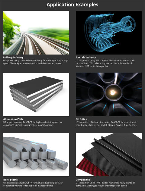 Application Examples Railway Industry:  UT system using patented Phased Array for Rail inspection, at high speed. The unique proven solution available on the market. Aircraft Industry: UT Inspection using FAAST-PA for Aircraft components, such turbine discs. With a booming market, this solution should interests NDT control companies. Aluminium Plate: UT inspection using FAAST-PA for high productivity plants, or companies wishing to reduce their inspection time. Oil & Gas:  UT inspection of tubes, pipes, using FAAST-PA for detection of Longitudinal, Transverse, and all oblique flaws in 1 single shot. Bars, Billets: UT inspection using FAAST-PA for high productivity plants, or companies wishing to reduce their inspection time Composites: UT inspection using FAAST-PA for high productivity plants, or companies wishing to reduce their inspection speed