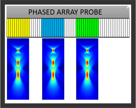 Multi-focus acquisition mode: The multi-focal is one of the other prominent capabilities of our UT FAAST Phased Array (PAUT) system allowing the generation of multifocal beams through a multi-element probe in one single shot. The principle of Phased Array is to calculate the delay laws to focus at a given depth and/or angle and this method is usually used with either 1D linear or 2D matrix multi-element probes. The advantage of Phased Array compare to mono-element, cylindrical or spherical focusing, is the possibility to calculate the delay laws by Software instead of having a concave probe for each focus depth. When considering the multizone testing with 1 multi-element probe, 1D or 2D matrix, the Multi-focal advanced acquisition mode from the Phased Array FAAST is a real strength as it allows the reduction of the number of required shots due to its capacity to transmit multiple focus delay laws. This gives a huge advantage regarding inspection speed and time. Multi-focus acquisition mode: A conventional Phased Array would need 3 sequential shots to send beams in 3 different focus points whereas we perform the same results in 1 single shot, without forgetting that our technology is able to transmit up to 16 beams (or more) at different focus points through only 1 multi- element probe while processing signals in real time. This is the reason of why the FAAST could make the difference when talking about mechanicals, number of probes, calibration time, and high productivity