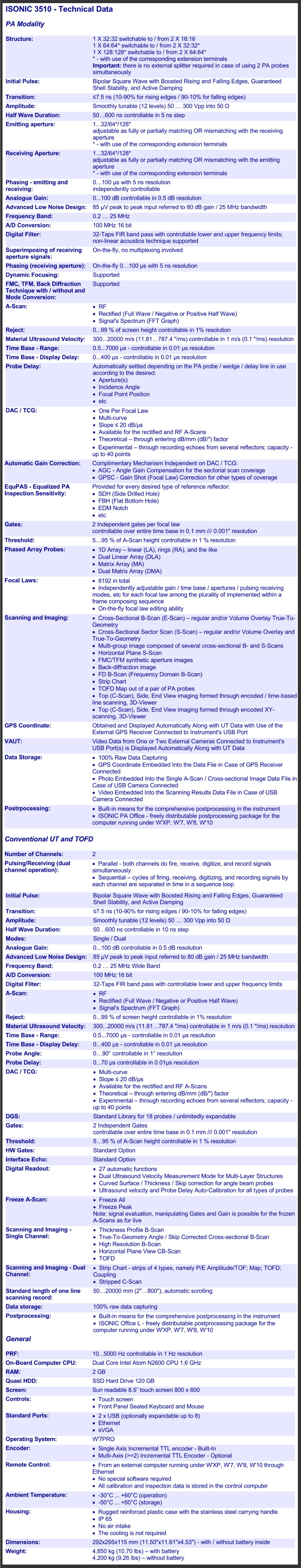 Designed and built under the drive for improved detection, productivity, and reducing of inspection cost ISONIC 3510 uniquely resolves the well-known nowadays challenges faced by NDT and QA management such as increasing of nomenclature and complexity of inspections combined with more demanding codes, standards, and norms along with significant loss of domain expertise. ISONIC 3510 carries the application based smart platform for the regular and advanced ultrasonic testing delivering • 5 inspection modalities – PA, TOFD, SRUT GW, conventional UT and a combination of them • outstanding ultrasonic performance and probability of detection • simplicity and intuitiveness of operation and data interpretation • rapidness in the creation of the new inspection solutions and procedures • easily expandable on-board solutions base • reduced training time and cost • comprehensiveness of automatically created inspection reports The optimal suitability of ISONIC 3510 for resolving of the huge variety of inspection tasks for all industries and processes involving ultrasonic NDT are strongly backed by the above listed features and technical particulars and specs below • Flaw Detection and Thickness / Corrosion Mapping • True-To-Geometry Volume Overlay and 3D Coverage and Imaging for: • Butt Welds (Planar and Circumferential) with • Symmetrical or Asymmetrical Bevel or Unbeveled • Equivalent or Different Thickness of Jointed Parts • Longitudinal Welds • Fillet, Tee-, and TKY- Welds - Flat and Curved Parts • Corner and Nozzle Welds • Open Corner and Edge Welds • Lap Joints • Elbow and Transit Welds • Simple and Complex Geometry Solid and Hollow Shafts and Axles • Drill Rods, Bridge Hanger Pins, Bolts • Turbine Blades • Flat and Curved Carbon Fiber, Glass Fiber, Honeycombs Parts Including Corners and Radius Areas • etc TOFD • SRUT GW - Short Range Guided Wave • Operating 1 or 2 PA Probes Simultaneously: No External Splitter Required • Fully Parallel Architecture 32:32 expandable to 64:64 / 128:128 • Freely Adjustable Emitting and Receiving Aperture • EquPAS – the Equalized Phased Array Ultrasonic Testing (PAUT) Sensitivity • FMC/TFM • FD B-Scan (Frequency Domain B-Scan) • VAUT - Video Aided UT • GPS • Automatic Defects Evaluation and Reporting • Intuitive User Interface • UT over IP: Remote Control, Observation of the Indications, Data Acquisition through LAN, Internet, Intranet, etc • and much more... Phased Array (PA) Modality: • Fully parallel 32:32 PA electronics expandable to 64:64 / 128:128 functionality • 2 PA probe terminals: 1 X 32:32 / 2 X 16:16 - switchable: there is no external splitter required for operating 2 PA probes simultaneously • Ability of work with PA probes carrying up to 64 and 128 elements • Independently adjustable emitting and receiving aperture with parallel firing, A/D conversion, and on-the-fly real time digital phasing • Phased array pulser receiver with image guided ray tracing / scan plan designer for the numerous types of simple and complex geometry welds, shafts, bolts, spindles, composite profiles, and the like • 8192 independently adjustable focal laws • On-the-fly focal law editing ability • Bi-polar square wave initial pulse: up to 300 Vpp / 100 dB analogue gain / 0.2...25 MHz bandpass / 16 bit 100 MHz ADC / 32 taps smoothly tunable digital filter • Regular and volume overlay B-Scan / Sector Scan (S-Scan) / Horizontal Plane S-Scan (CB-Scan) coverage accompanied with all-codes-compliant A-Scan based evaluation • Multigroup coverage composed of several cross-sectional B- and S- Scans • Strip Chart • Single group and multigroup Top (C-Scan), Side, End View imaging formed through encoded / time-based line scanning, 3D-Viewer • Single side / both sides weld coverage with use of one PA probe / pair of PA probes • TOFD Map out of a pair of PA probes • Top (C-Scan), Side, End View imaging formed through encoded XY- scanning, 3D-Viewer • Built-in automatic coupling monitor and lamination checker for wedged probes • Equalized cross sectional coverage sensitivity: TCG-independent gain per focal law adjustment providing pure angle gain compensation for S-Scan, etc • DAC, TCG • Dynamic Focusing • FMC, TFM, Back Diffraction Technique with / without and Mode Conversion • Processing of diffracted and mode converted signals for defects sizing and pattern recognition • Operating Linear Array (LA), Ring Array (RA), Matrix Array (MA), Dual Matrix Array (DMA), Dual Linear Array (DLA), and other PA probes • FFT signal analysis • FD B-Scan (Frequency Domain B-Scan) for the material structure characterization and other special tasks • 100% raw data capturing • Automatic alarming defects / generating of editable defects list upon scanning completed • Advanced defects sizing and pattern recognition utilities Conventional UT and TOFD: • 2 channels • Single / dual modes of pulsing/receiving for every channel • Bi-polar square wave initial pulse: up to 300 Vpp / 100 dB analogue gain / 0.2...25 MHz bandpass / 16 bit 100 MHz ADC / 32 taps smoothly tunable digital filter • Regular A-Scan • Thickness B-Scan • True-to-Geometry flaw detection B-Scan – straight / angle beam probes • CB-Scan • TOFD • Strip Chart and Stripped C-Scan • Parallel or sequential pulsing/receiving and A/D conversion • DAC, DGS, TCG • FFT signal analysis • 100% raw data capturing General: • Dual Core 1.6 GHz clock 2 GB RAM 120 GB SSD W'7PRO on-board control computer • Intuitive User Interface • Single and multi-axis encoder connection • Comprehensive postprocessing and data reporting toolkit • Remote control and data capturing with use of a regular PC with no need in special software • No intake air / no cooling IP 65 light rugged case • Sealed all-functional keyboard and mouse • 8.5” bright touch screen • Ethernet, USB, sVGA terminals ISONIC 3510 uniquely