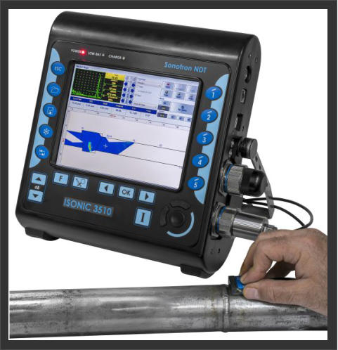 Ultrasonic Flaw Detectors Page Button Sonotron ISonic 3510 Ultrasonic Phased Array Flaw Detector showing it in action with A-Scan & Phased Array view of welded pipe being inspected