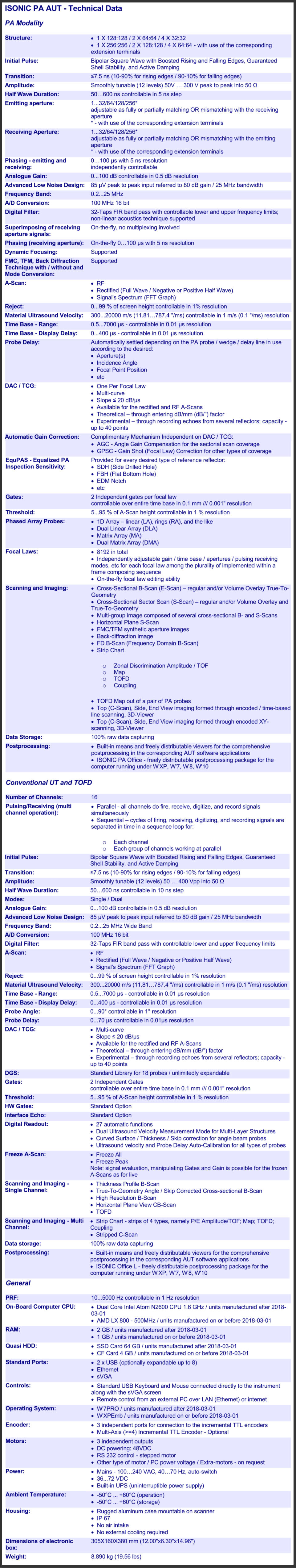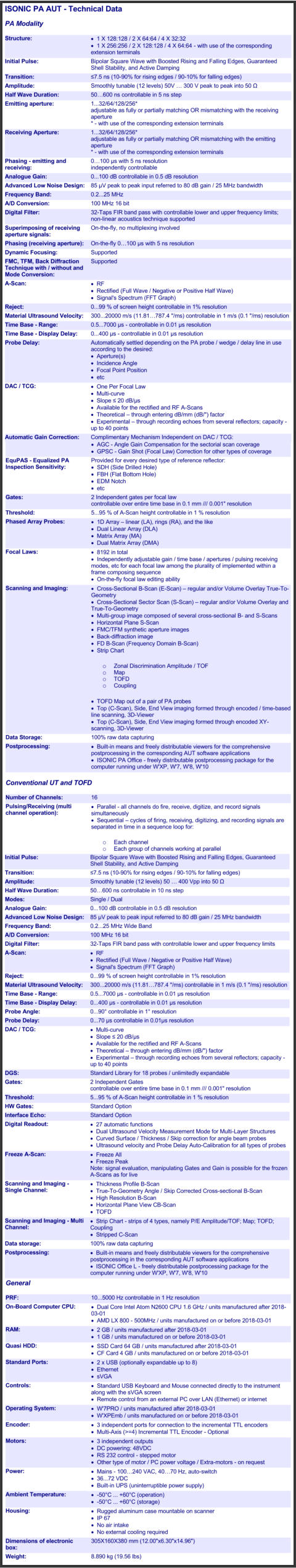 Since 2007 ISONIC PA AUT - the super powerful all-weather-operation platform is used widely in the world as a core component of the integrated Automatic Ultrasonic Inspection (AUT) systems combining Phased Array (PA), conventional, and TOFD modalities Among the typical applications resolved by ISONIC PA AUT based automatic inspection systems are: • AUT of girth welds according to ASTM-1961 • AUT of heavy thickness welds in the pressure vessels, reactors, etc according to radiography replacement codes • AUT of the railway axles and wheels • Immersion Ultrasonic Testing (IUT) of various materials and parts • IUT validation of the results obtained by various AUT machines In March 2018 it was launched the next generation ISONIC PA AUT  platform carrying the features listed below: • Fully parallel 128:128 (2 X 64:64 / 4 X 32:32) PA and 16 independent conventional / TOFD channels carried by portable light weight unit controllable either over Ethernet OR directly using the standard PC keyboard and mouse • Expandable to 256:256 (2 X 128:128 / 4 X 64:64) PA functionality • Operating up to 4 PA probes and 16 conventional probes / pairs of probes simultaneously • Up to 4096 PA and 512 conventional / TOFD channels functionality thanks to the ability of multiple units operation (up to 32) controlled from one computer • Parallel A/D conversion and on-the-fly digital phasing and superimposing of PA elements signals, no multiplexing involved • Free settling of emitting and receiving aperture • Hardware / software synchronization • 3 motor powering and control terminals • 3 encoder terminals • Built-in UPS (uninterruptible power supply) • Emergency stop button • Rugged IP 67-sealed case mountable on scanner • All-Weather-Operation: -50°C ... +60°C • No intake air • No water or other type of cooling required • 9 kg weight Thanks to the powerful on-board W7PRO computer with Dual Core Intel Atom N2600 1.6 GHz CPU, 2 GB RAM, and 64 GB SSD drive carried by the latest ISONIC PA AUT platform in addition to numerous AUT applications it may be used as very powerful stand-alone Desktop UT Workstation, suitable for using as: • Laboratory masterpiece equipment running all PA inspection applications implemented by Sonotron NDT portable PA flaw detectors ISONIC 3510 and ISONIC 2009 UPA Scope • Core-element for the in-factory inspection stations