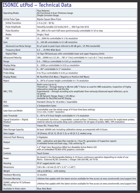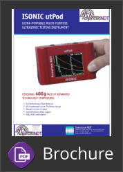 ISonic utPod The Swiss Army knife of UT - The Best Stuff for the Rope Access UT Personal 400g pack of advanced technology comprising: • Top Performance Flaw Detector • All-Functional A-Scan Thickness Gauge • Simple Corrosion Gauge • Through-Paint / -Coating Thickness Measurement with Use of Regular Probes • Far Side Wall Thickness Measurement in Tubes with Use of Regular Probes • Supervisor Lock / Unlock Settings Function • Comprehensive Data Logger • Fully USB Controllable Miniature dimensions and lightest weight ever! ISONIC utPod delivers full functionality of the top performance ultrasonic flaw detector such as: • Bi-polar square wave pulser with tunable shape, pulse duration and amplitude (up to 300 V pp) and boosted leading / falling edges enhancing ultrasound penetration for various materials characterized either by high or low grain, sound attenuation, and the like • 100 dB analogue gain / 0.2...25 MHz bandpass / 100 MHz sampling rate • 32-Taps FIR band pass digital filter with controllable lower and upper frequency limits • Analogue performance A-Scan with no range limit for RF display mode • Up to 2 kHz pulse repetition frequency • Multi-curve DAC, DGS / TCG • 2 independent gates • Automatic evaluation including trigonometric functions, thickness and curvature correction, etc • AWS / API defect evaluation • High Colour Resolution QVGA screen – 3.2” Active Matrix LCD with an embedded PICASO-GFX2 graphics controller • Built-in horn and virtual lamps on the screen to alarm the defect indications • 2 on-board rechargeable long durability Li-Ion batteries ISONIC utPod LF is a modified version of ISONIC utPod adapted for low frequency ultrasound applications. It is characterized by the receiver frequency range and limit for manipulating the duration of initial pulse different from ISONIC utPod