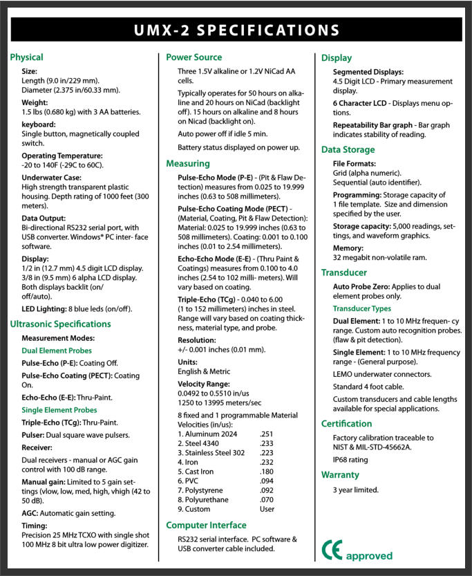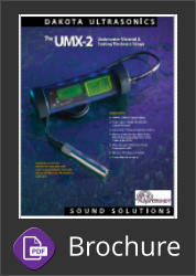 Dakota - UMX-2 UMX-2 underwater material and coating thickness gauge, designed for offshore inspections, and rated to a depth of 1000 feet (300 meters). The UMX-2 is very versatile, offering both Dual & Single element transducers. Equipped with multiple measurement mode options, the UMX-2 will meet all your application requirements. Onboard 5,000 point data logger, all UMX-2 settings stored for each measurement, along with an actual A-Scan waveform. Our DakView java-based PC or MAC OSX software makes this a very functional kit. Powered by a 100MHz DSP platform using FPGA technology. Two Channels – Dual pulsers and receivers. Up to 140Hz pulse repetition rate. Display update rate of 25 times per second. Adjustable gain settings – vlow, low, med, hi, vhi. Automatic gain control (AGC). Time corrected gain (TCG). Massive data storage (32 Megabit of non-volatile RAM). Features 1000 ft. (300m) depth rating. Captures an A-Scan waveform snapshot with every measurement; viewable using our Windows PC interface software. Measurement modes: Dual Element – Pulse-Echo, Pulse-Echo w/Coating, Echo-Echo. Single Element – Triple-Echo (TCG). Automatic: probe zero and probe recognition. Data storage formats: Alpha numeric grid and sequential w/auto identifier. Windows PC software included. 3 year limited warranty.