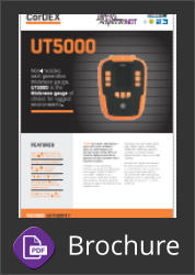 CorDEX - UT5000 UT5000 Intrinsically Safe thickness gauge with CorDEX CONNECT™ measures metal thickness for Non-Destructive Testing (NDT) and Predictive Maintenance (Pdm) on pipelines and fixed equipment within hazardous locations. UT5000 is a next generation thickness gauge packed with proven technologies: CorDEX CONNECT™ uses RFID + Software to tag measurements with their location then organises the data, giving the engineer a view of the pipeline at any specific location. The unique corrosion mode option helps identify spots of thinning; MultiECHO™ technology improves accuracy on uneven surfaces; onboard memory stores up to 1000 readings. The CorDEX UT5000 is ATEX and IECEx certified for Gas & Dust (Zone 21). From storage tanks to dust conveyors, UT5000 can measure thickness and detect safely problems in virtually any explosive environment. The Ruggedized transducer and Brass wear ring prevent undue wear on the transducer surface and ensure the UT5000 is tougher than most. Designed for rugged environments, the shock resistant skin protects a 3.1 inch (8cm) colour screen and has easy-to-feel raised buttons. The intrinsically safe dual-element, 4MHz transducer is adjustable up to 8Hz with accuracy of +/- 0.05mm (0.002inch). Features ATEX and IECEx Certified for Zone 1 IIC T4 hazardous areas Features CorDEX CONNECT™ Intrinsically safe probe supplied as standard full Colour, backlit screen EchoEcho Technology to measure thickness through painted surfaces Drop-down menus to select the correct material velocity Multiple calibration and zeroing modes for repeatable accuracy On-board data recorder and RFID scanner, store up to a thousand automatically linked to tag location Menu ‘flip’ function allows use by both left and right handed technicians