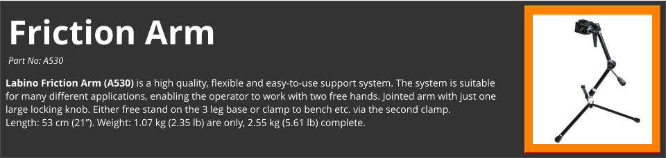 Labino Friction Arm (A530) is a high quality, flexible and easy-to-use support system. The system is suitable for many different applications, enabling the operator to work with two free hands. Jointed arm with just one large locking knob. Either free stand on the 3 leg base or clamp to bench etc. via the second clamp. Length: 53 cm (21”). Weight: 1.07 kg (2.35 lb) are only, 2.55 kg (5.61 lb) complete.