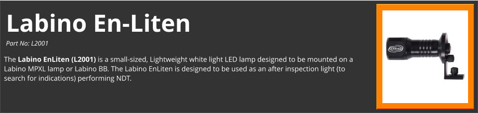 The Labino EnLiten (L2001) is a small-sized, Lightweight white light LED lamp designed to be mounted on a Labino MPXL lamp or Labino BB. The Labino EnLiten is designed to be used as an after inspection light (to search for indications) performing NDT.