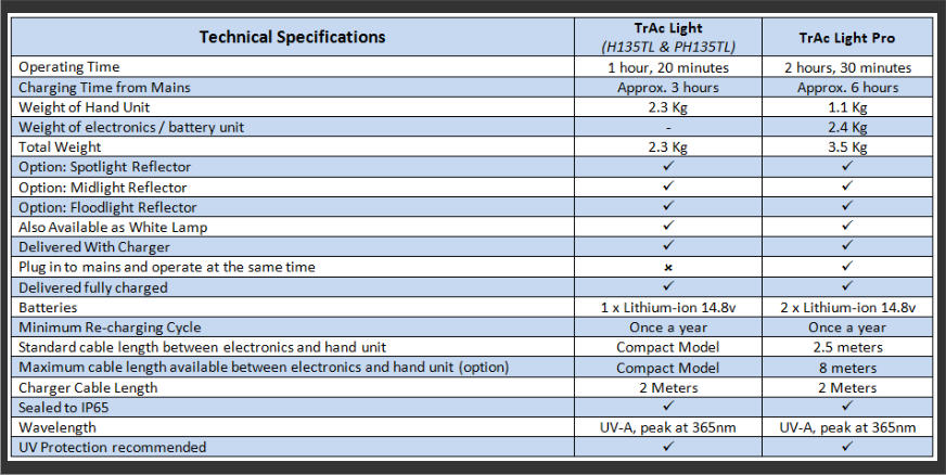 Labino UV Light - Duo TrAc Series - MPXL Available as Floodlight, Midlight or Spotlight Type: TrAc Light Pro Battery Powered can also be operated via the mains with a pistol style handle, separate base unit for  electronics and battery. Weight: 1.2kg (Lamp Unit) & 2.4kg (Electronic/battery Base Unit) Operating Time: 2 hours 30 minutes approx. (continuous)