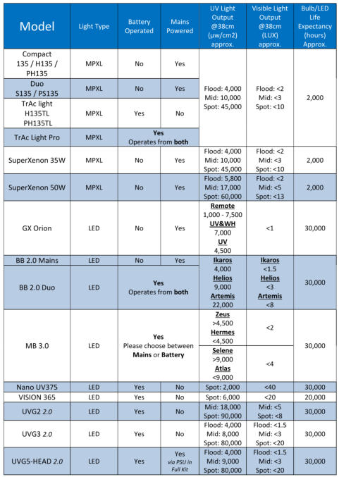 Choosing which type of UV light is right for you? Many factors will affect the best choice of UV Light for your application. To help narrow down the options for you here are a few questions to think about while choosing the light you require. • Do you require it to be portable (battery operated) or mains powered only? • Is the size of the lamp critical? (Access or weight issues may limit you to torch size lights.) • Will you be able to darken the area or will it it be daylight? • Do you need to illuminate the inspection area from a distance? • Do you need to cover large areas quickly? • Do you have specifications or standards to meet? (e.g. Visible light output limits, intensity outputs minimum or maximum, Specific Wavelength requirements etc.) • The budget - Obviously the wide range of UV lights covered will vary a lot in price, from the basic UV LED torch through to the high intensity portable gas discharge bulb lights. There are many other things to consider but if you need any assistance in your choice then please do not hesitate to contact us for further help. Below is a comparison chart highlighting a few of the basic factors when choosing a UV light which may assist you in narrowing down your choices.