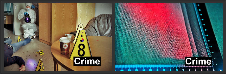 Crime & Forensics Labino helps you see what your eyes can’t see at a crime scene. At a crime scene, fast and accurate detection of possible traces is of vital importance. Many biological fluids are fluorescent in nature. When such traces are illuminated with light of the right wavelength they fluoresce and are detectable to the investigator. The degree to which various substances become visible when using different filters depends on the state of the substance and the surface on which the substance exists. Deciding what light source to use to achieve the best result in finding traces at the crime scene is an art. It takes years of experience to learn what light to use depending on the occasion - it’s not an exact science. New users using ALS (Alternative Light Sources) can of course use combinations of light and goggles to determine the best option for that occasion using trial and error until confidence and knowledge has been built up. We make it possible for each user to put together their own unique ALS kit. No crime scene looks the same. No crime scene investigator uses the same method, but we can all share experiences and learn from each other. Labino does offer professional training in using light at a crime scene. All their trainings are held by Crime Scene Investigators. Further Information on Forensic Lighting and application can be found here.