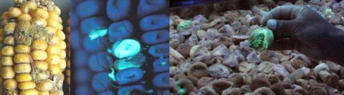 Detection of Aflatoxin and Mould with UV at early stage Aflatoxins are cancerous chemicals produced by special types of mould that are contaminants of such foodstuff and feeds as corn, peanuts, sorghum, copra, pistachio nuts and cottonseed. Aflatoxin contamination usually does not appear in the field. Commonly, it develops when harvested crops are stored in damp places where mold grows easily. If aflatoxin is detected at early stage, it can be isolated and stopped from spreading. This helps to prevent contamination of products, financial loss, and ensure the safety of farm products. A simple UV test helps to identify the presence/absence of aflatoxin and mould. If a fresh sample fluoresce greenish-gold under the UV light illumination, most probably aflatoxin is present, but additional laboratory tests are typically required to make final conclusions.