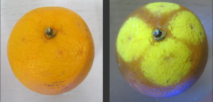 Visualize early Penicillium with UV By illuminating with the Labino UV light you are able to visualize early Penicillium spp. infections on citrus fruit. The infected tissue fluoresces bright yellow as shown in the pictures below. The Labino BB Helios performs extremely well with this application.